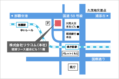 | 本社 | 〒900-0015 沖縄県那覇市久茂地1丁目7番1号 琉球リース総合ビル11階 TEL 098-867-2584(代表) FAX 098-867-2583 E-mail info@ryucom.co.jp |