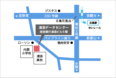 | 浦添データセンタ | 〒901-2121 沖縄県浦添市内間4丁目1番1号 琉球銀行浦添ビル6階 TEL 098-876-3121 FAX 050-3730-3763 |
