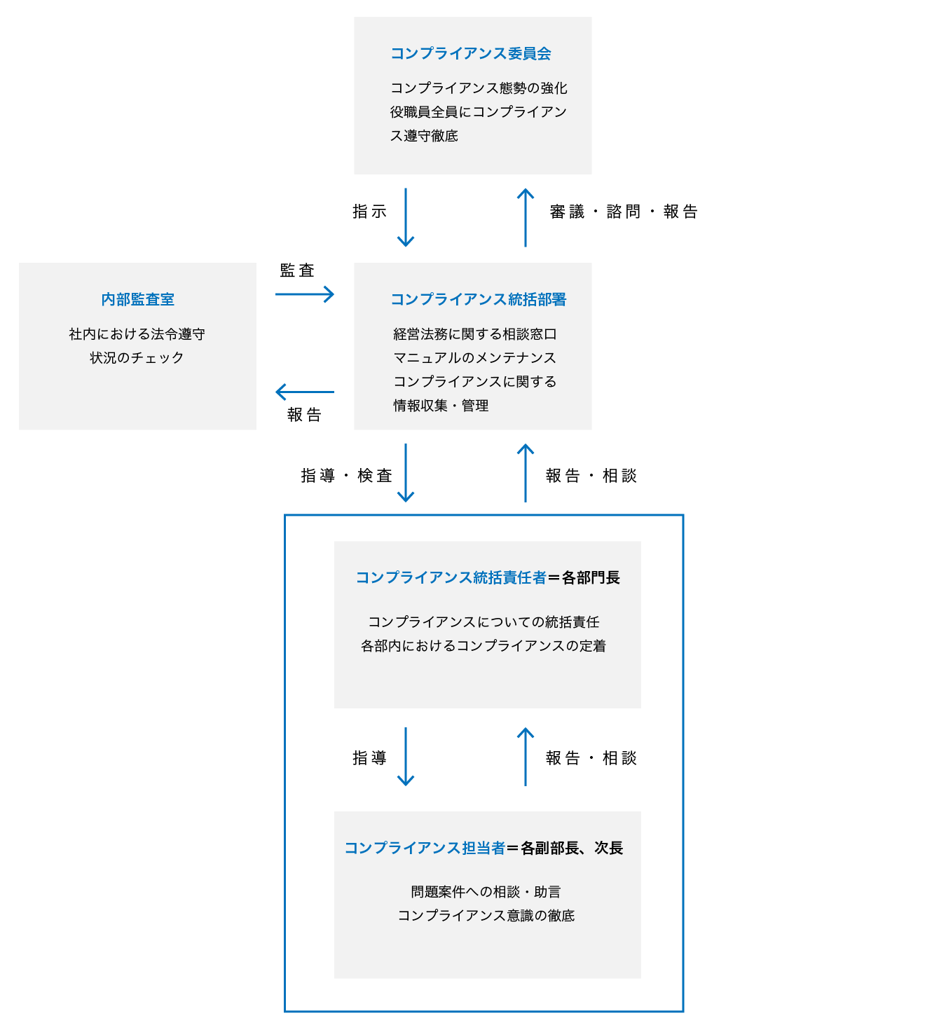 コンプライアンス体制の強化および実効性ある施策の迅速化を図るとともに、役職員全員へのコンプライアンス遵守の定着化を促進させるために、以下のような管理体制でコンプライアンスの推進に取り組んでます。