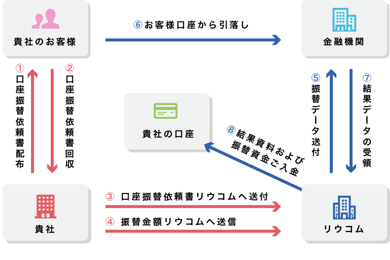 貴社ご指定の振替日にお客さまご指定口座より引落しをいたします。⑦各金融機関より結果データの受領